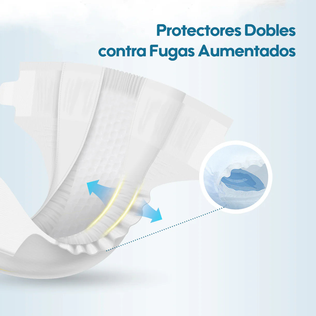Los pañales ultrasuaves de Aiwibi presentan cientos de miles de microporos transpirables para la circulación de los gases, que ayudan a reducir el riesgo de irritaciones o erupciones en la delicada piel del bebé.Protección 3D antifugas laterales, con velcro 3M repetible, elástico y flexible para garantizar un ajuste firme alrededor de la cintura del bebé, y pañales fabricados con Sandia SAP (Japón) y pulpa de terciopelo de algodón Weyerhaeuser (EE.UU.), que es altamente absorbente, manteniendo la la piel del bebé seca y fresca, al tiempo que le permiten moverse libremente sin limitaciones. Fabricados con materiales de las mejores marcas del mundo, son hipoalergénicos, sin perfume ni parabenos, y débilmente ácidos, próximos al pH de la piel del bebé, por lo que son seguros y respetuosos con la piel y no irritan su delicada piel, proporcionándole el mejor cuidado.